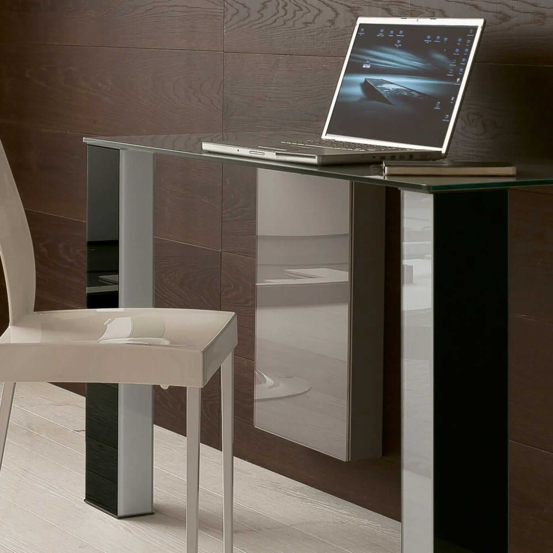 The high aesthetic value furnishing compositions by the Ponti Terenghi brand decorate the environment with their colors and style, recreating unique furnishing atmospheres. The Hide desk by Ponti Terenghi in glass will give character and charm to a room furnished with furniture and accessories with modern references. In our showroom, you can touch the quality of the company's modern glass desks models, just like this solution in the photo. Highly versatile and multifunctional, modern glass complements serve various functions: they enhance the practical qualities and aesthetic value of the room.
