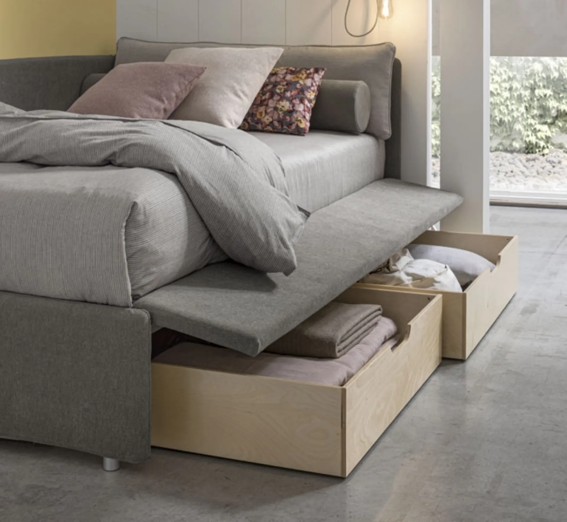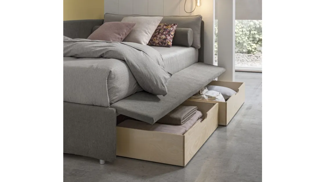 Discover the Joy Pull-out model in fabric shown in the photo: it's right for you if you're looking for single beds with pull-out bed